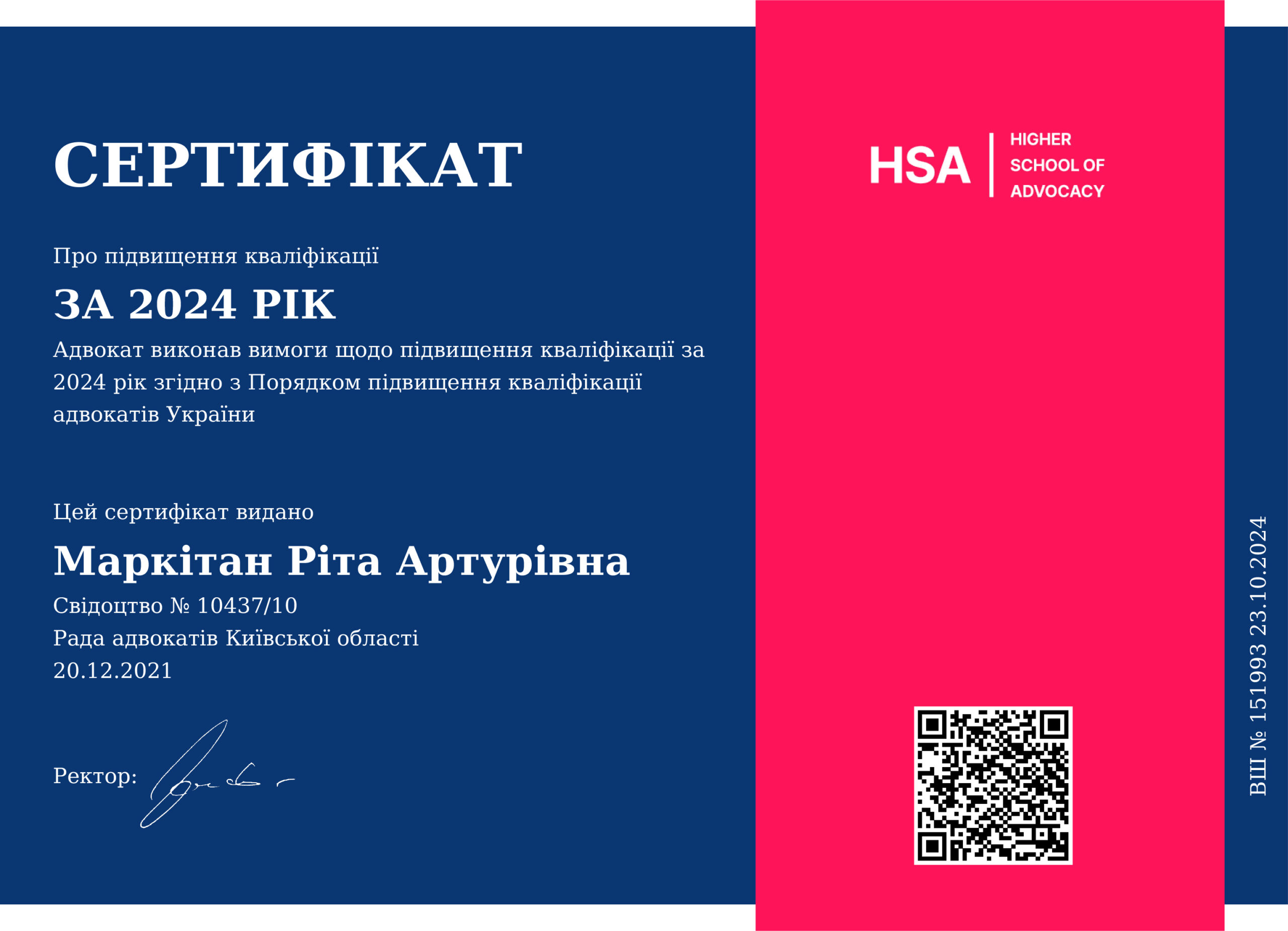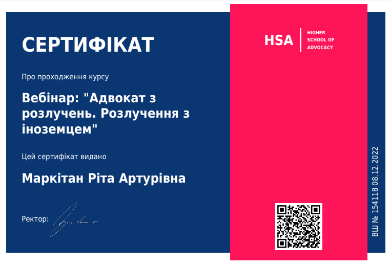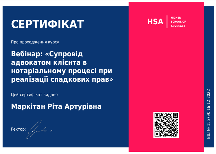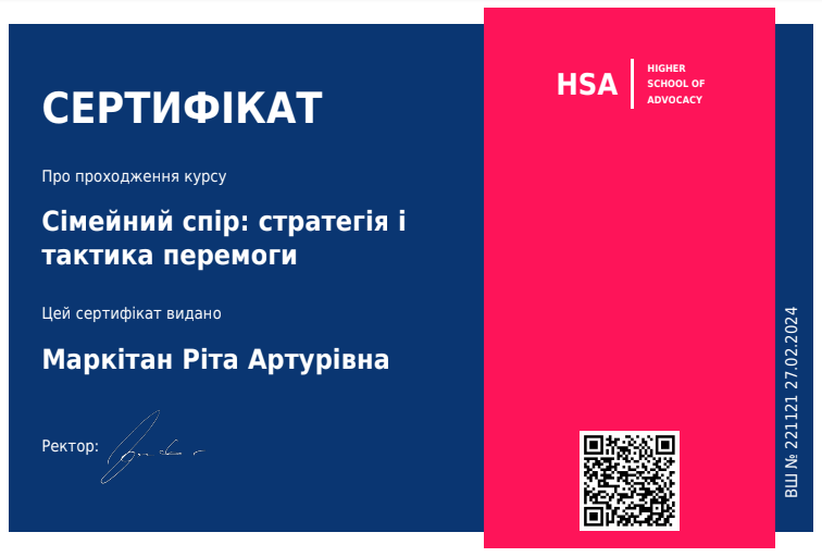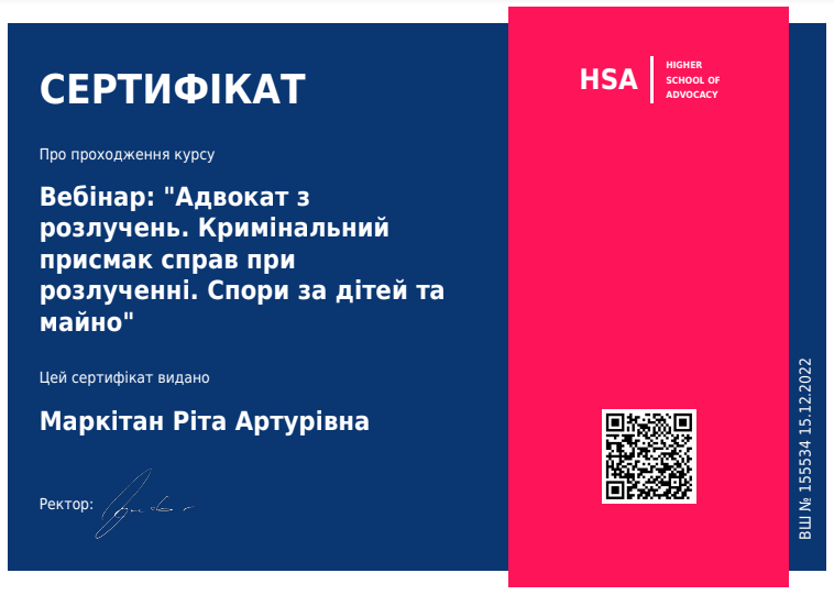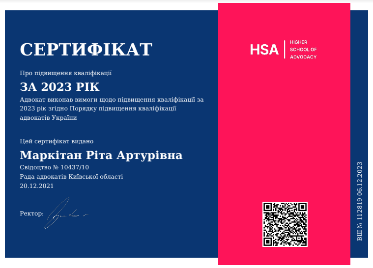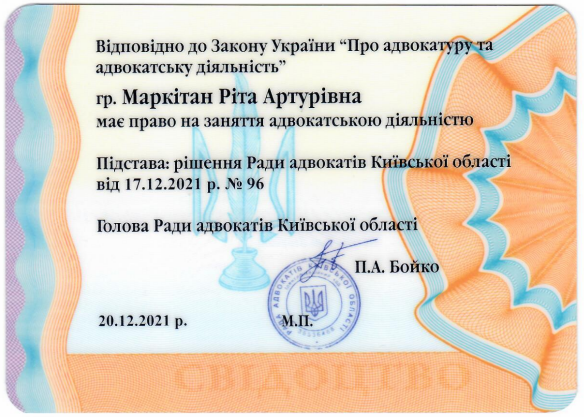 20.12.2021 отримала свідоцтво на право заняття адвокатською діяльністю КС №10437/10. З цього часу працюю адвокатом у місті Києві та Київській області.