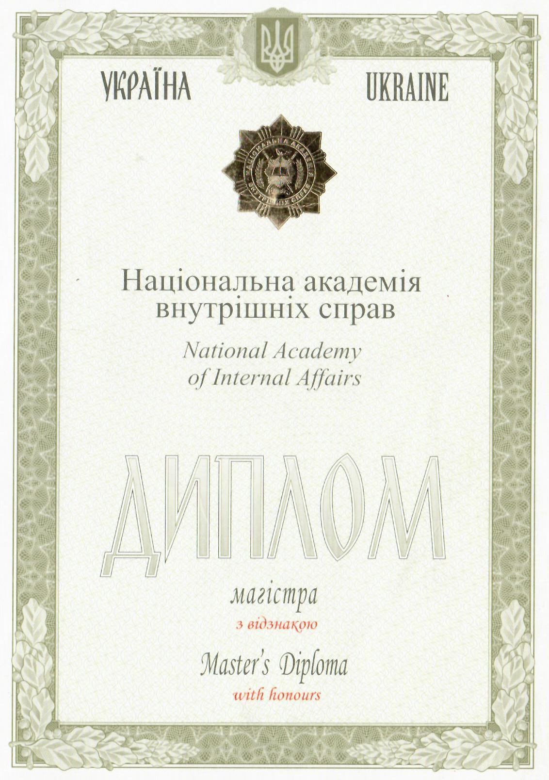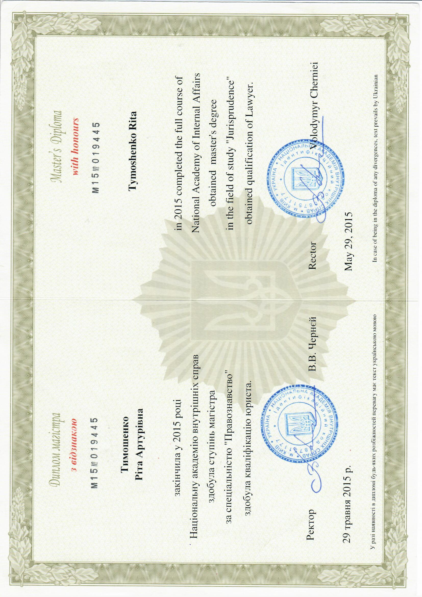 29.05.2015 року з відзнакою закінчила Національну академію внутрішніх справ та здобула ступінь магістра за спеціальністю «Правознавство».